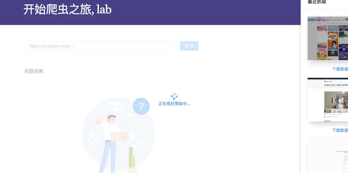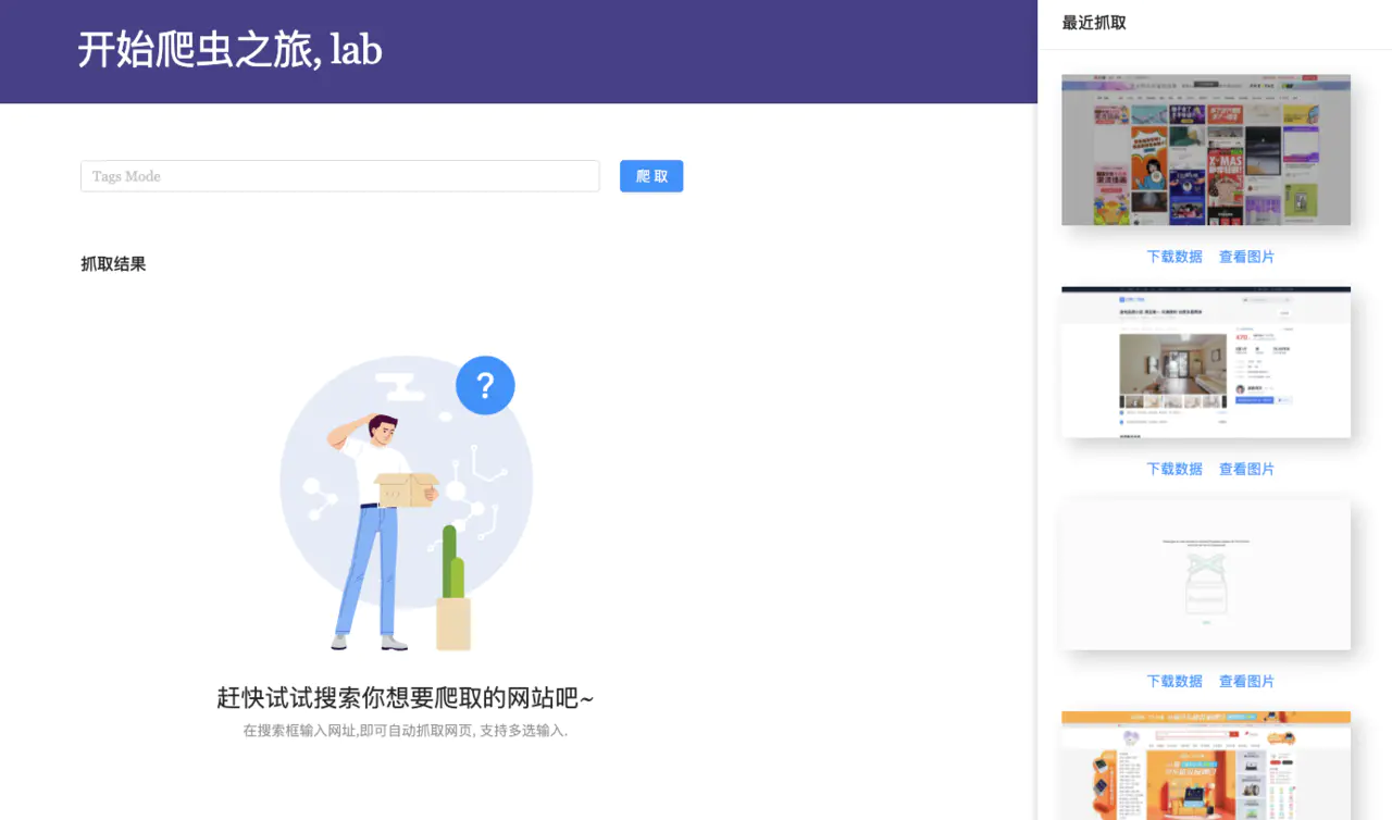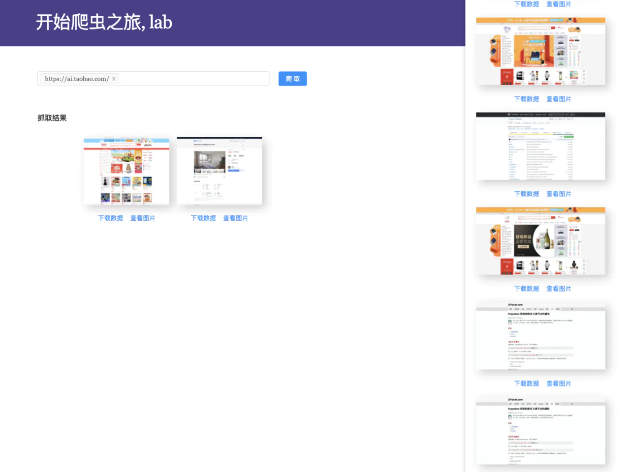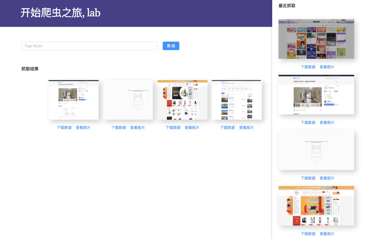 上图所示的就是我们要实现的爬虫平台, 我们可以输入指定网址来抓取该网站下的数据,并生成整个网页的快照.在抓取完之后我们可以下载数据和图片.网页右边是用户抓取的记录,方便二次利用或者备份.