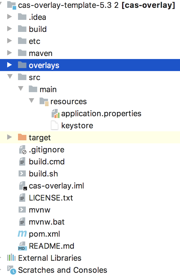 我们在下载的 cas-overlay-template 项目中,新建 src/main/resources 目录,并将 overlays/org.apereo.cas.cas-server-webapp-tomcat-5.3.14/WEB-INF/classes/application.properties 文件和刚刚生成的 keystore 文件拷贝进来: