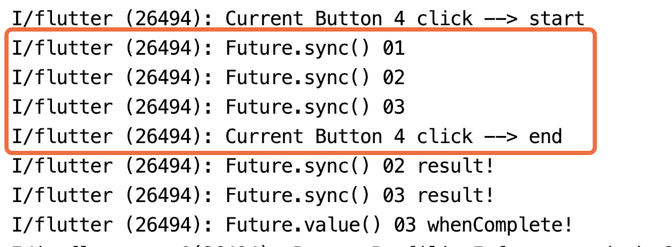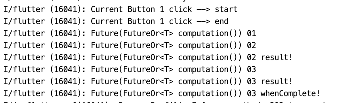 .whenComplete(() => print('Future.delayed() whenComplete! CurrentTime = ${DateTime.now().millisecondsSinceEpoch}'));