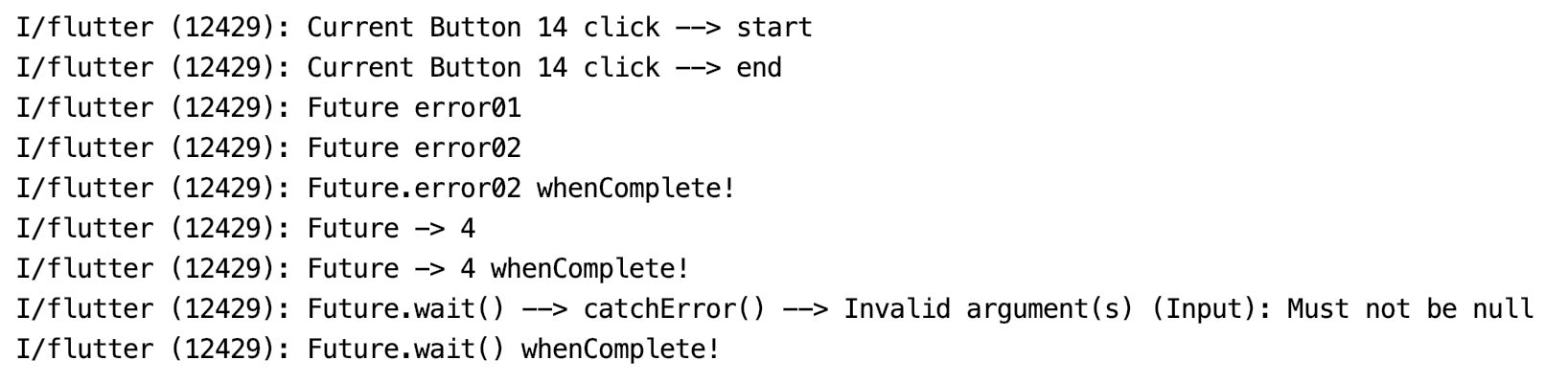a. Future.wait() 只会捕获 Futures 中第一个异常,且当前 Future 未进行捕获,即:Future 中都进行了 catchError 则不会进入 wait().catchError();