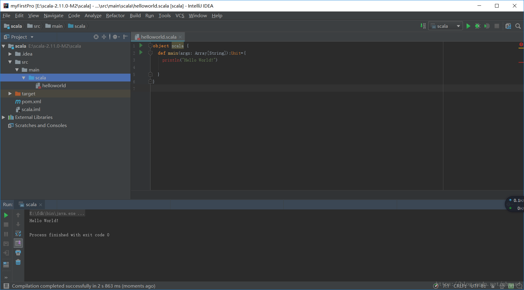 scala文件夹 上,右键选择New,然后选择Scala Class,随后设置好程序的名称,并且记得将其设置为一个Object(类似于Java中含有静态成员的静态类),正常的话,将会打开这个Object代码界面,并且可以看到IntelliJ IDEA自动添加了一些最基本的信息;