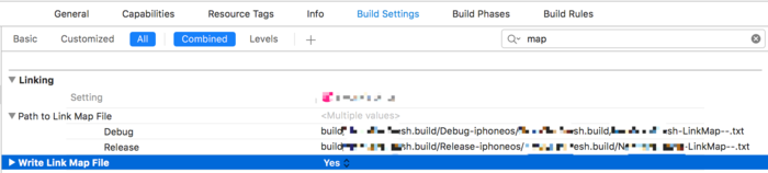 点击工程,选择Build Setting选项,搜索map,可以看到如下界面。将Write Link Map File设置为Yes后,Build结束后,会在默认路径下生成一个Link Map File文件,该文件是txt格式的。点击Path to Link Map File,可以设置Debug或Release模式下的生成路径。
