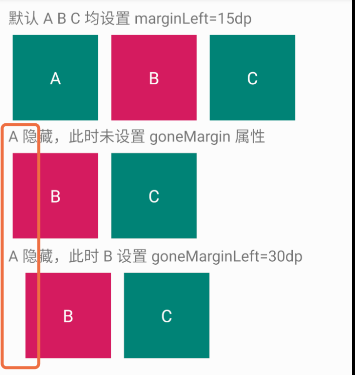在应用中,margins 为外边距,在使用 ConstraintLayout 关联布局时,添了 _goneMargin 属性;即控件 B 是以控件 A 作为关联基础,当控件 A 动态隐藏时,可以通过 _goneMargin 设置控件 B 的新的外边距;其中 _goneMargin 属性需要设置在非隐藏控件 B 中;