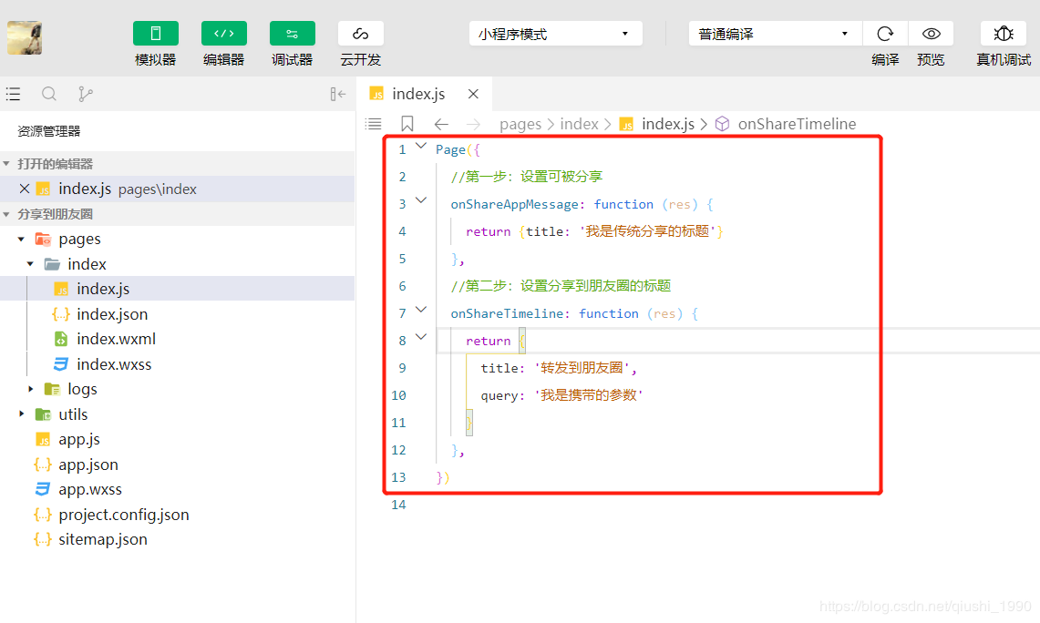 onShareAppMessage是我们默认就有的配置,也就是onShareTimeline是我们新加的,其实你只要配置好onShareTimeline这段代码,就可以轻松的实现小程序分享到朋友圈功能了。