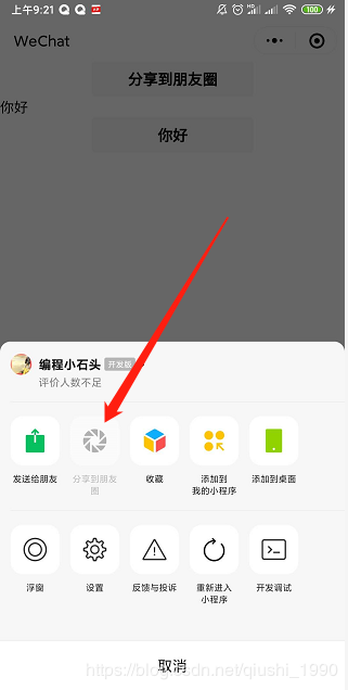 默认的分享到朋友圈的按钮是灰色的,如下图