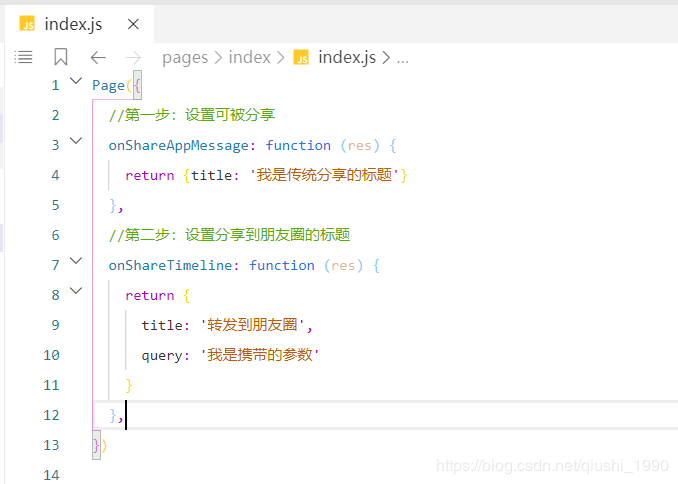 或许你都想象不到,小程序分享到朋友圈真是太简单了。只需要下面这几行代码,并且这几行代码是小程序页面的默认配置。