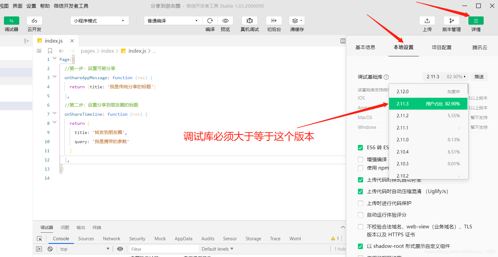 其实小程序分享到朋友圈只需要满足下图红色框里的两个条件。