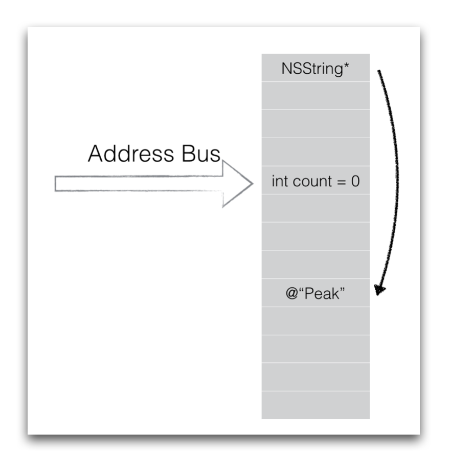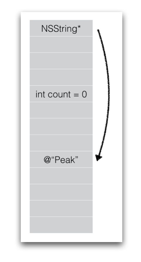 以64位系统为例,指针NSString*是8个字节的内存区域,int count是个4字节的区域,而@“Peak”是一块根据字符串长度而定的内存区域。