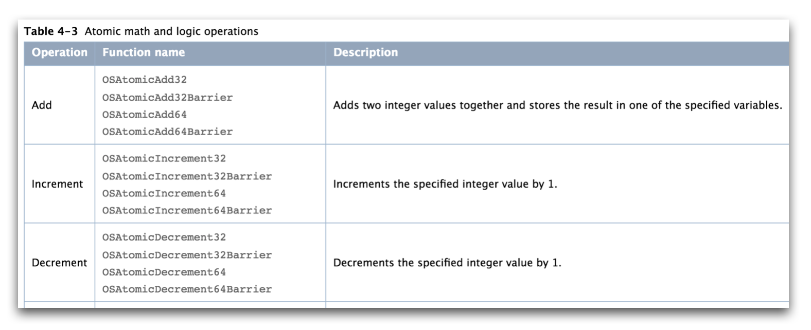 其实除了各种锁之外,iOS上还有另一种办法来获取原子性,使用Atomic Operations,相比锁的损耗要小一个数量级左右,在一些追求高性能的第三方Framework代码里可以看到这些Atomic Operations的使用。这些atomic operation可以在/usr/include/libkern/OSAtomic.h中查到: