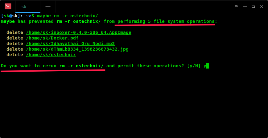 maybe has prevented rm -r ostechnix/ from performing 5 file system operations: delete /home/sk/inboxer-0.4.0-x86_64.AppImage delete /home/sk/Docker.pdf delete /home/sk/Idhayathai Oru Nodi.mp3 delete /home/sk/dThmLbB334_1398236878432.jpg delete /home/sk/ostechnixDo you want to rerun rm -r ostechnix/ and permit these operations? [y/N] y