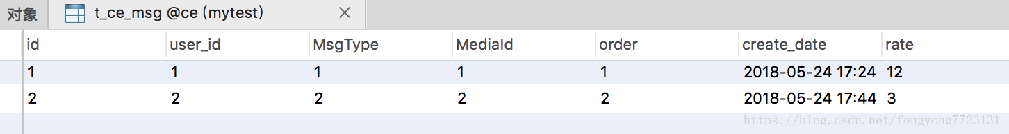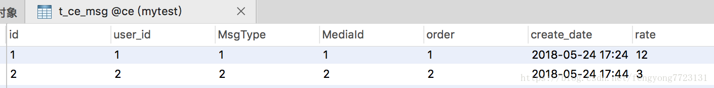 打开数据库客户端工具,创建表,添加数据,并删除数据,这里以t_ce_msg为例,首先创建两条数据,1和2。