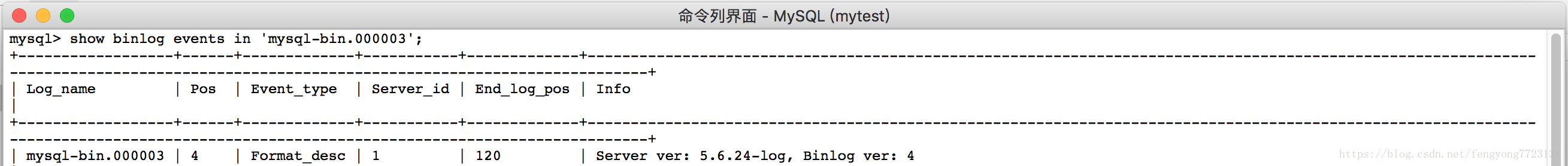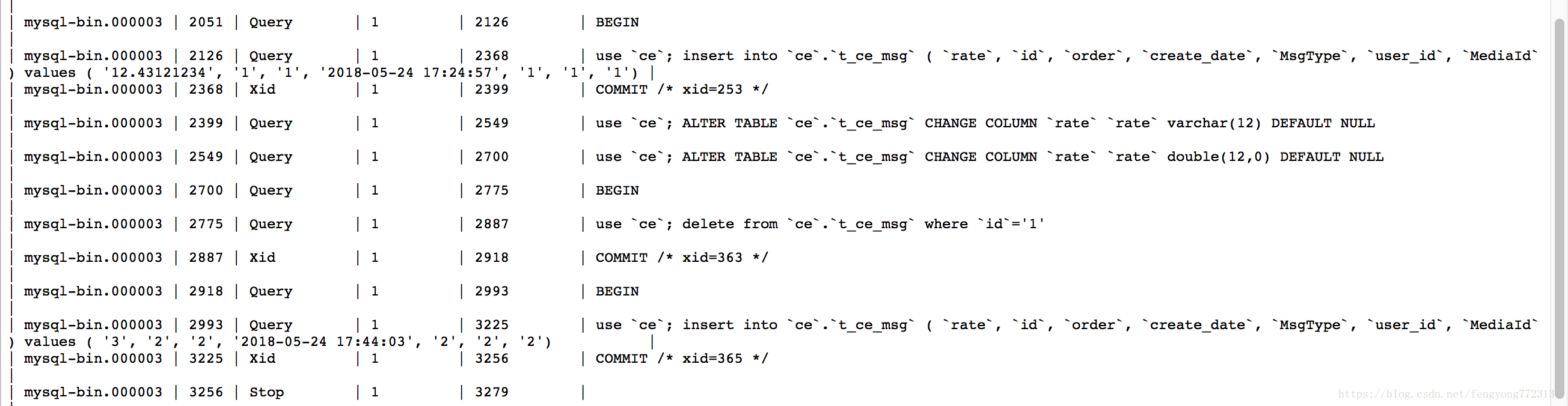 接着查看binlog日志,在这里我们直接使用客户端的功能就可以,比较方便,命令为 show binlog events in 'mysql-bin.000003';