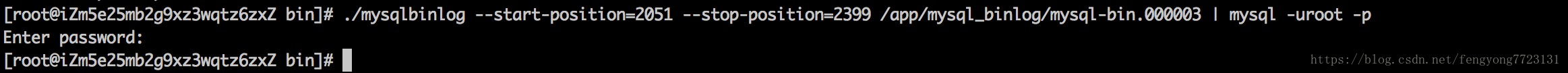 在日志中我们可以清楚的看到,其实我不是添加1和2数据然后删除1的,而是先添加1,删除1,又添加2的,不过这不重要,接下来就要使用binlog来恢复已经被删除的1数据了,注意看日志,日志里记录了我添加数据的sql和删除数据的sql,现在我要恢复数据,并不需要执行日志里那条删除1数据的sql,可以看到,添加1数据的开始(BEGIN)到提交(COMMIT),是从2051(Pos)到2399(End_log_pos)。执行恢复需要有用到mysqlbinlog命令,在这里,我直接连接到了数据库的服务器,进入mysql的bin目录进行操作的,命令 mysqlbinlog --start-position=2051 --stop-position=2399 /app/mysql_binlog/mysql-bin.000003 | mysql -uroot -p ,回车后输入密码。