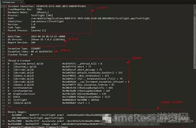 1)crash标识是应用进程产生crash时的一些标识信息,它描述了该crash的唯一标识(E838FEFB-ECF6-498C-8B35-D40F0F9FEAE4),所发生的硬件设备类型(iphone3,1代表iphone4),以及App进程相关的信息等;
