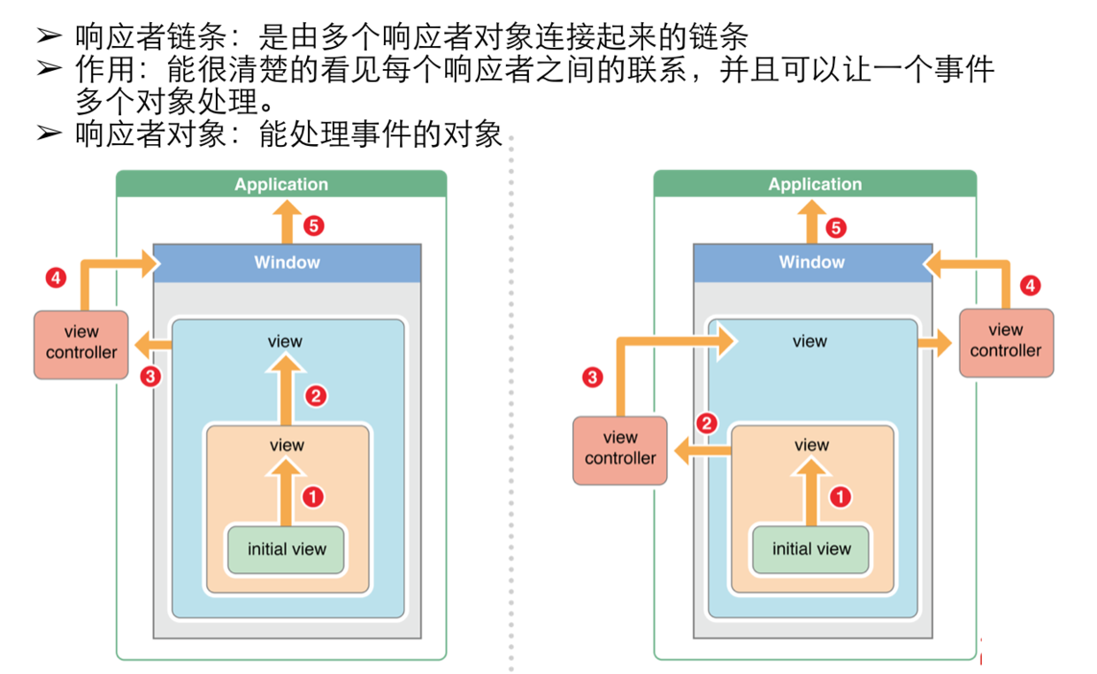 响应链:由离用户最近的view向系统传递。initial view –> super view –> …..–> view controller –> window –> Application