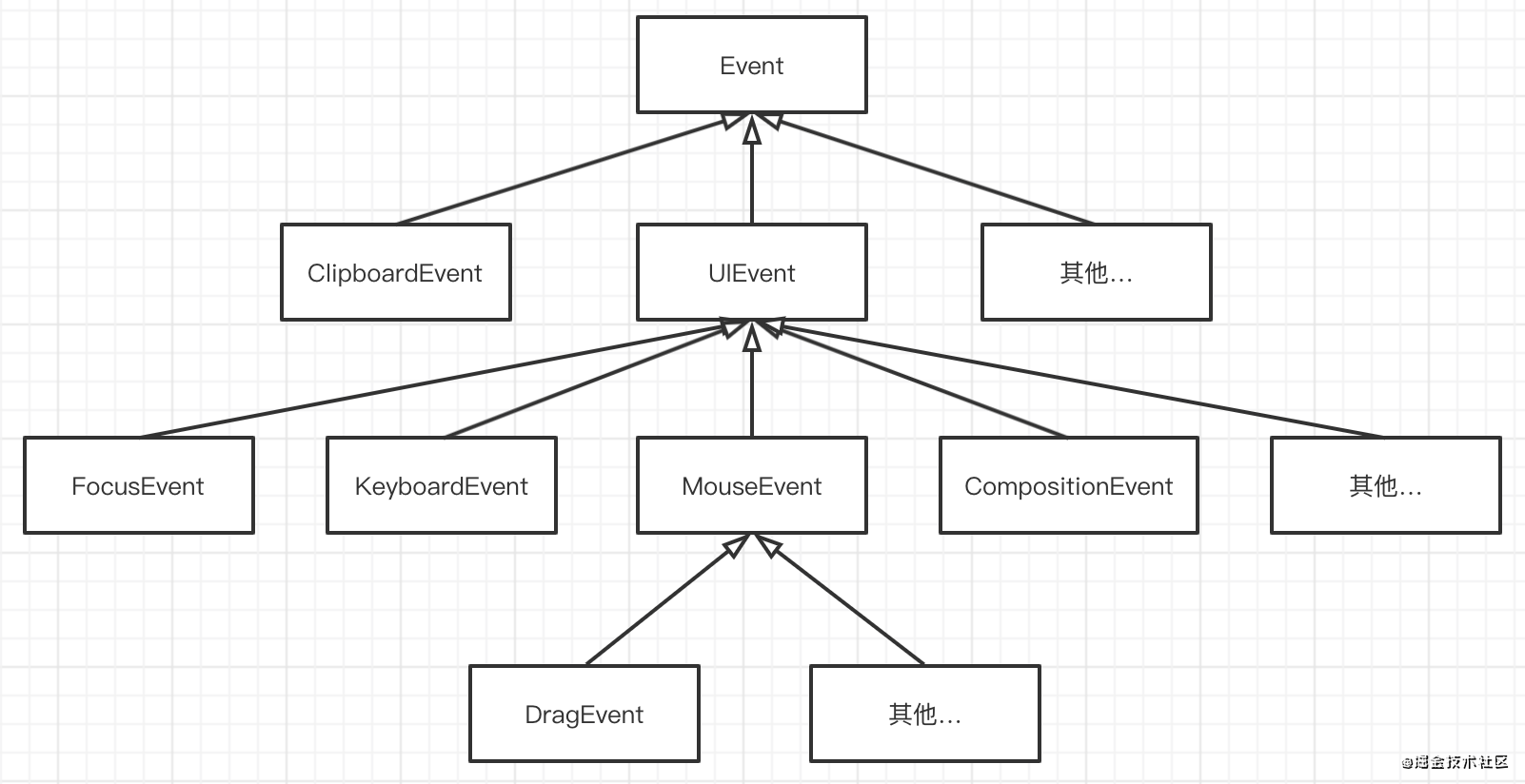他们的继承关系如下图。其中 UIEvent 表示的是用户在 UI 触发的一些事件。因为事件不仅仅是用户触发的,还有 API 脚本触发的,所以要单独拿出一个 UIEvent ,作为区分。