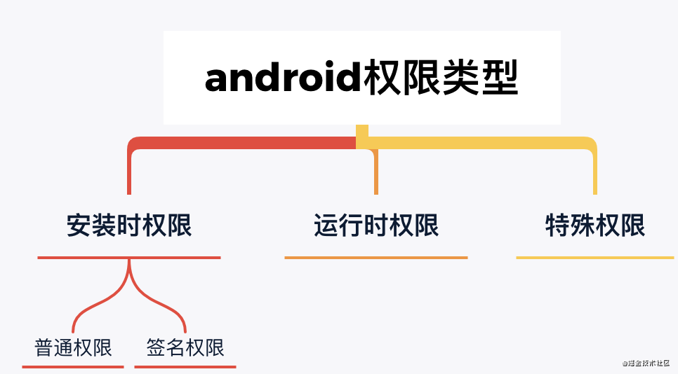 这里顺便介绍一下android的权限划分,android将权限分为不同的类型,包括安装时权限、运行时权限和特殊权限,每种权限类型都指明了当系统授予应用该权限后,应用可以访问的受限数据范围以及应用可以执行的受限操作范围。