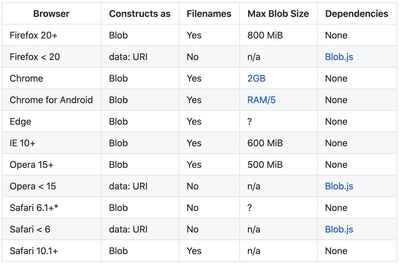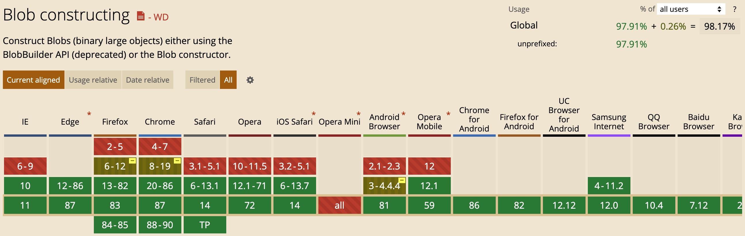 FileSaver.js 是 HTML5 的 saveAs() FileSaver 实现。它支持大多数主流的浏览器,其兼容性如下图所示: