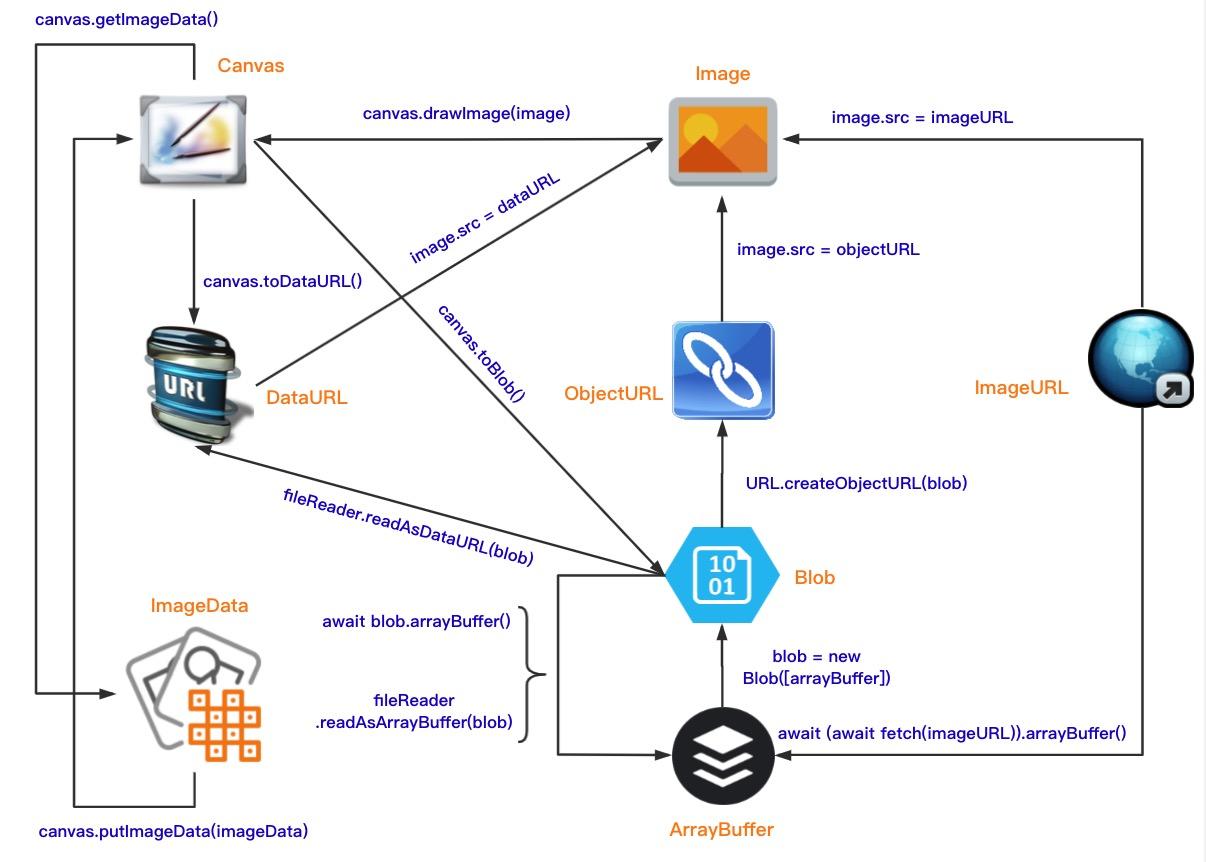 其实对于 FileReader API 来说,除了支持把 File/Blob 对象转换为 Data URL 之外,它还提供了 readAsArrayBuffer() 和 readAsText() 方法,用于把 File/Blob 对象转换为其它的数据格式。在 玩转前端二进制 文章中,阿宝哥详细介绍了 FileReader API 在前端图片处理场景中的应用,阅读完该文章之后,你们将能轻松看懂以下转换关系图: