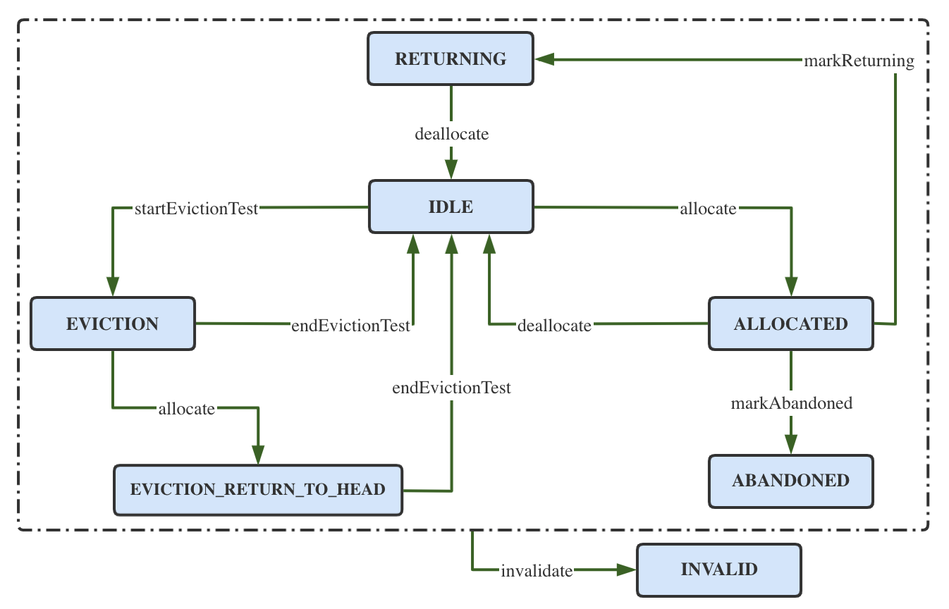 3、在释放对象的时候,则首先从活跃对象集合activeObjects 删除元素,删除完成后,将对象增加到空闲对象集合idleObjects中,需要注意的是,在释放对象过程中也需要去校验对象的状态。当对象状态不合法的时候,对象应该进行销毁,不应该添加到idleObjects中。释放成功后则PoolState通过notify或者notifyAll唤醒等待中的获取操作。