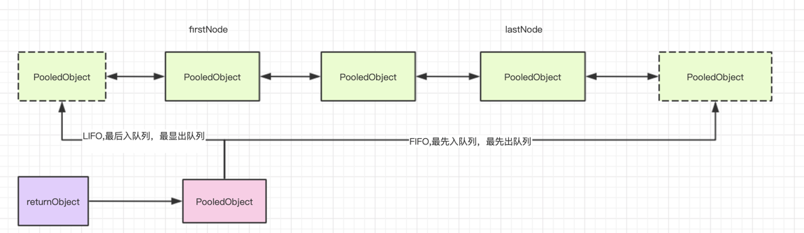对象池中使用了双端队列LinkedBlockingDeque来存储对象,LinkedBlockingDeque对列支持FIFO和FILO两种策略,基于AQS来实现队列的操作的协同。