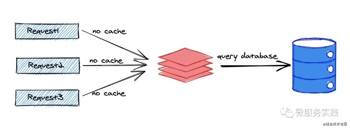 缓存穿透存在的原因是请求不存在的数据,从图中我们可以看到对同一个数据的请求1会先去访问缓存,但是因为数据不存在,所以缓存里肯定没有,那么就落到DB去了,对同一个数据的请求2、请求3也同样会透过缓存落到DB去,这样当大量请求不存在的数据时DB压力就会特别大,尤其是可能会恶意请求打垮(不怀好意的人发现一个数据不存在,然后就大量发起对这个不存在数据的请求)。