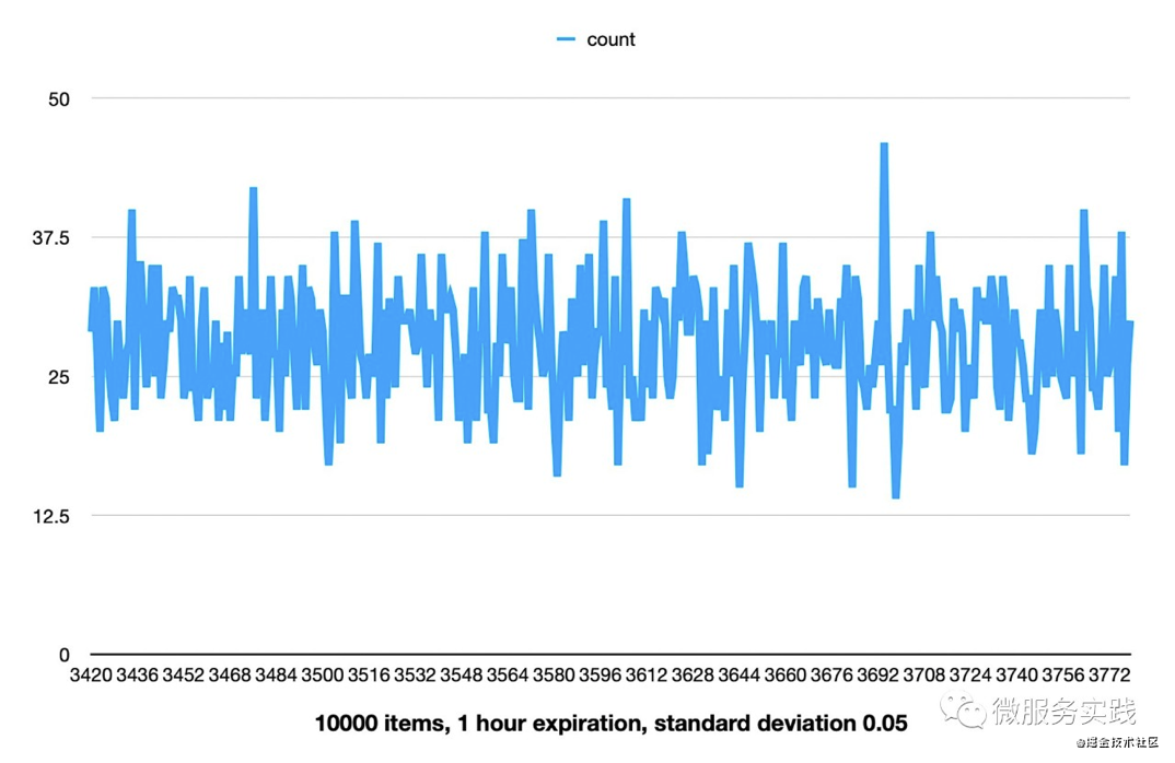 我们做个实验,如果用1万个数据,过期时间设为1小时,标准偏差设为5%,那么过期时间会比较均匀的分布在3400~3800秒之间。如果我们的默认过期时间是7天,那么就会均匀分布在以7天为中心点的16小时内。这样就可以很好的防止了缓存的雪崩问题。