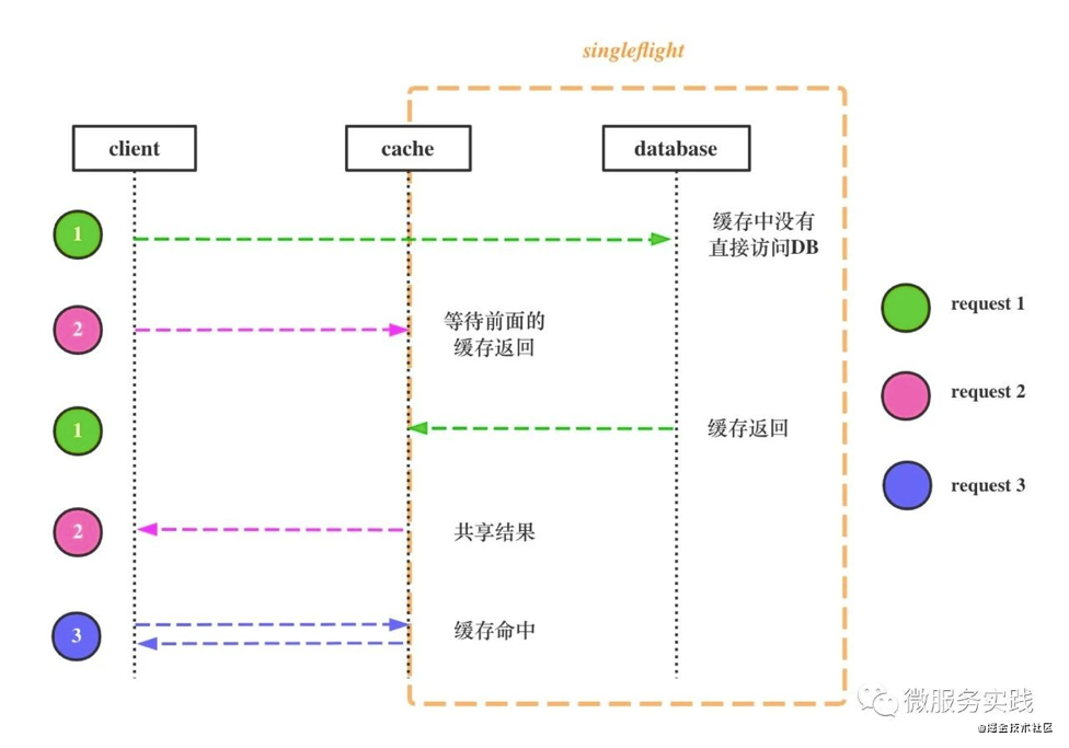 - 粉色请求到达,请求相同数据,发现已有请求在处理中,等待绿色请求返回,singleflight模式