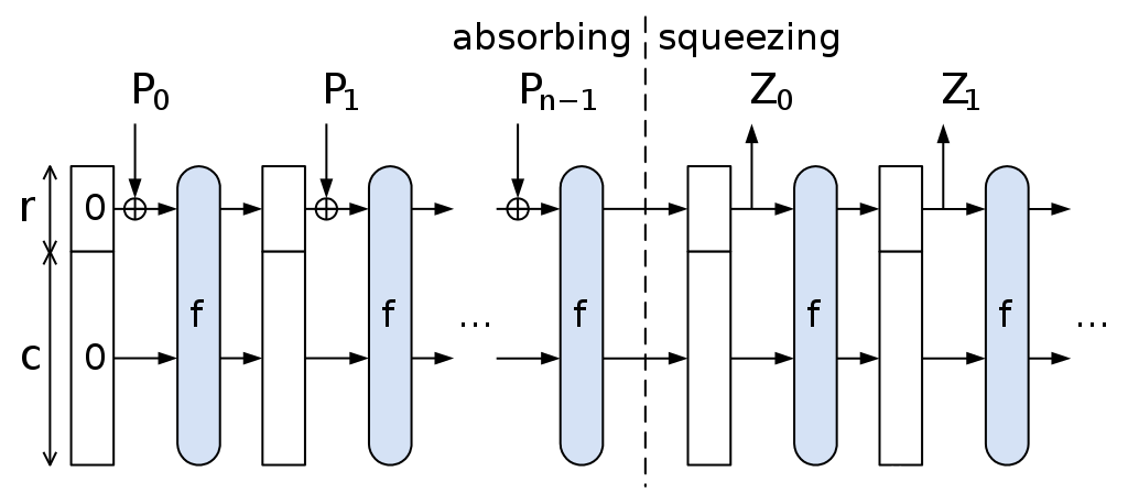 SHA3算法是基于海绵结构的,我们看下海绵结构的工作原理: