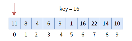 比如,给定一个数组[11, 8, 4, 6, 9, 1, 16, 22, 14, 10],给定目标值 key,若找到,则返回其数组下标;否则,返回 -1: