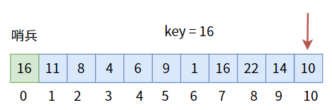 为此,我们要特意在数组中留出一个位置给“哨兵”,并且把哨兵的值设置为目标值: