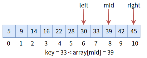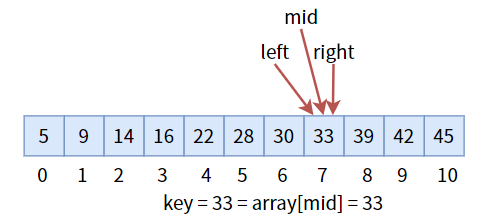 中间值 33 等于目标值key,返回其下标,即 mid。