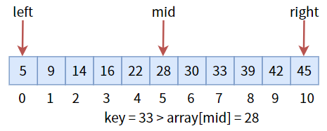 中间值 28 小于目标值key,说明目标值在右半区,所以更新三个标志位,进入右半区,然后继续比较: