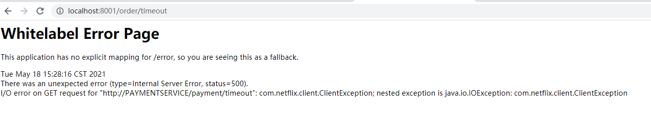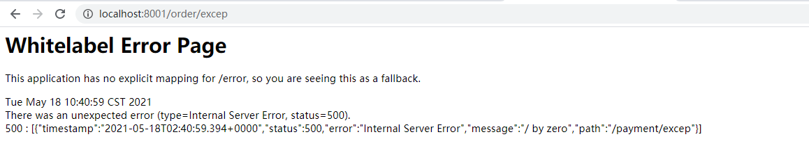 org.springframework.web.client.HttpServerErrorException$InternalServerError: 500 : [{"timestamp":"2021-05-18T02:40:59.394+0000","status":500,"error":"Internal Server Error","message":"/ by zero","path":"/payment/excep"}]