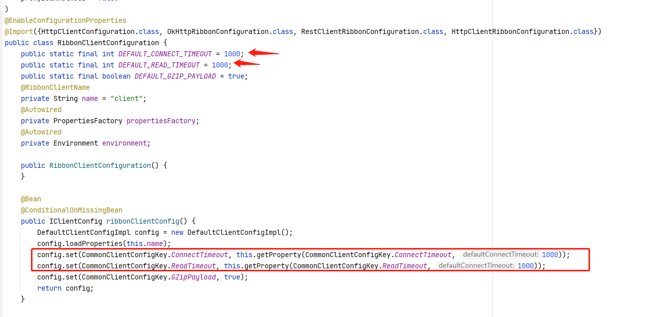 先看看Ribbon的源码,可以看到连接超时时间和读取超时时间都是1000ms,而在上面的PaymentController中我们设置的业务处理时间是3s(TimeUnit.SECONDS.sleep(3)),所以orderService的服务间调用会读取超时。
