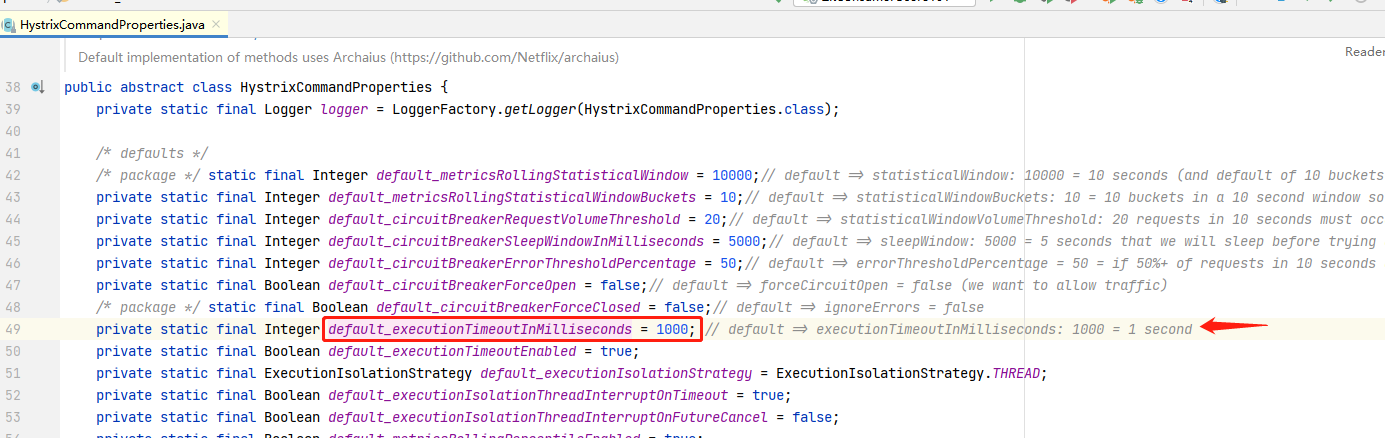 - execution.isolation.thread.timeoutInMilliseconds:方法执行超时时间,默认值是 1000,即 1秒,此值根据业务场景配置。