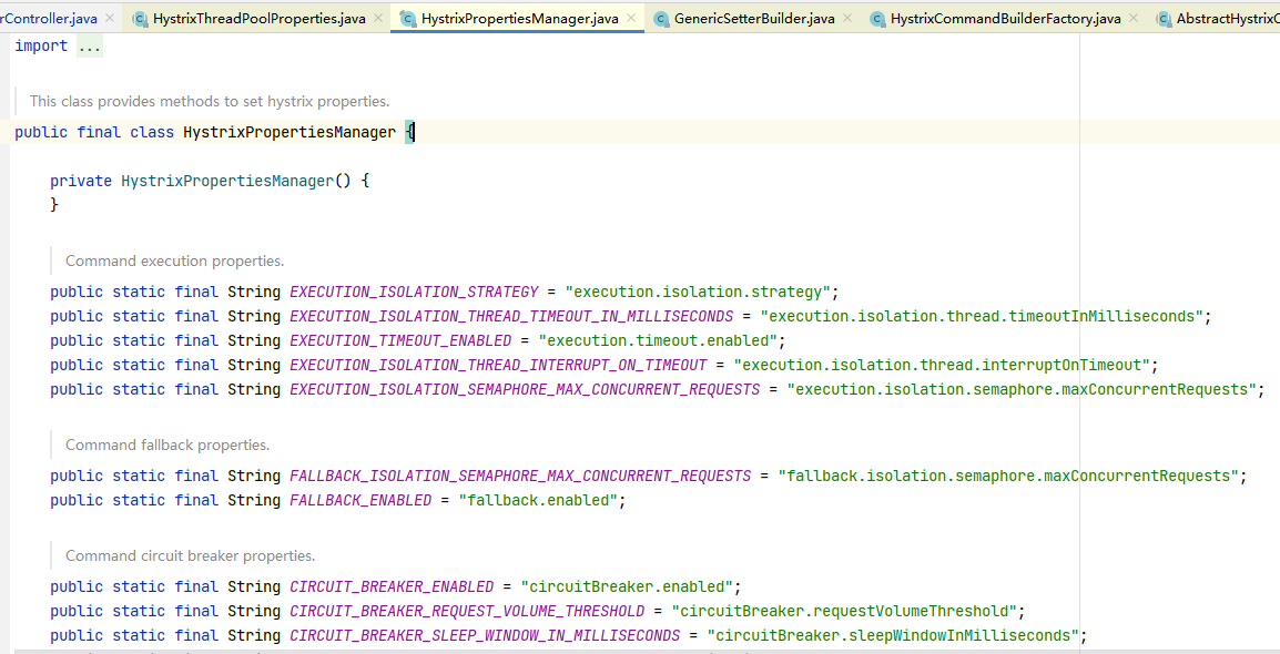 注意:HystrixCommandProperties和HystrixThreadPoolProperties中所有的属性,必须在HystrixPropertiesManager存在的静态属性才能进行配置,否则抛出异常unknown thread pool property:xxx。