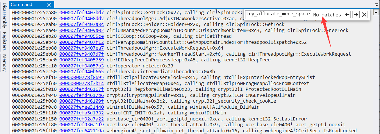 我去,竟然没有 try_allocate_more_space 关键词,这就和 his 不是一个套路了,😩😩😩 有可能这个dump踩的不是特别好的时机,有可能程序正处于某些怪异行为中。