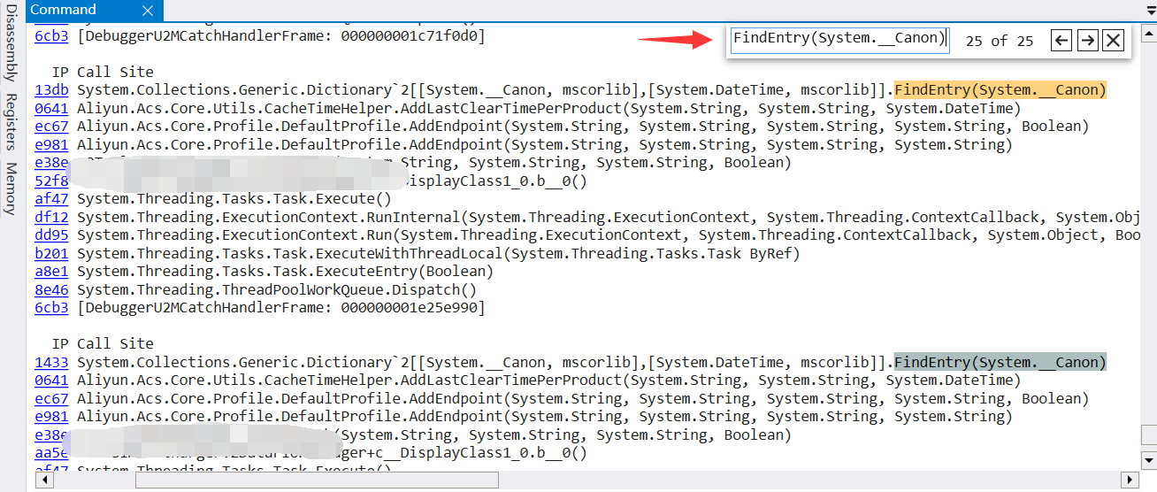从图中可以看出当前有 25 个线程正卡在 FindEntry(System.__Canon) 处,而且从调用堆栈上看,貌似是 aliyun 封装的dll,为什么有这么多的线程卡在这里呢?这就给人一个很大的问号? 接下来我就把阿里云的这段代码给导出来看看到底发生了什么。