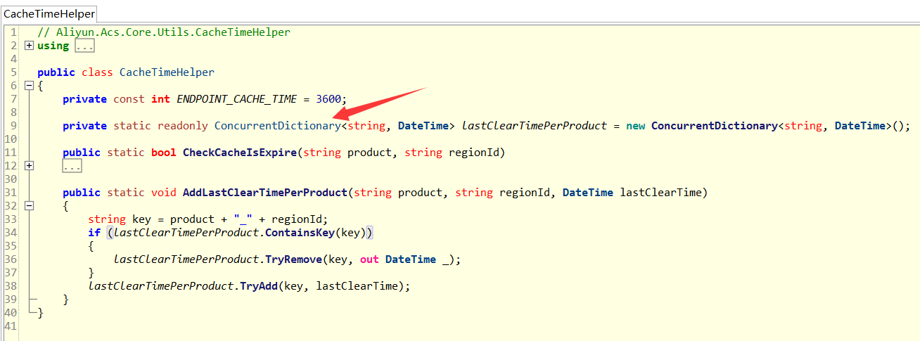 到这里,有没有看出这个 CacheTimeHelper 有什么问题吗? 对,竟然在多线程环境下用的是非线程安全的 Dictionary<string, DateTime>,这就很有问题了。