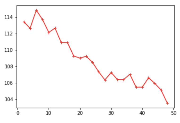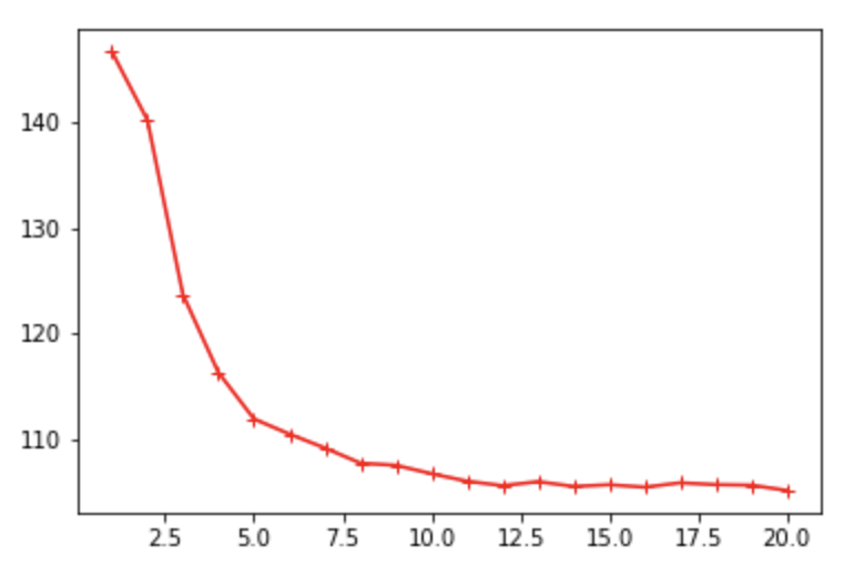plt.plot(hyper_params, rmse_values,c='r',linestyle='-',marker='+')