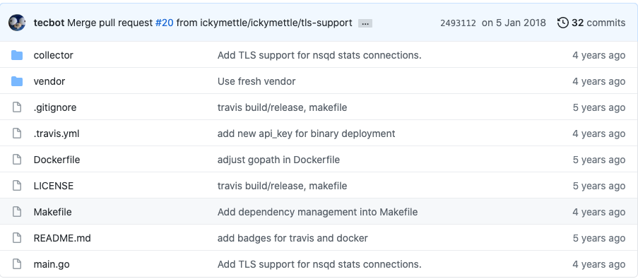 Prometheus 的官方文档[https://prometheus.io/docs/instrumenting/exporters/]上对 exporter 有推荐,我顺着链接找到了官方推荐的 NSQ exporter[https://github.com/lovoo/nsq_exporter]。NSQ exporter 这个项目年久失修,最近的一次提交已经在 4 年前。
