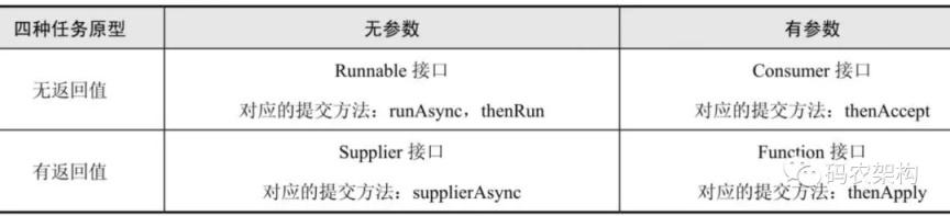 提交给 CompletableFuture 执行的任务 有四种类型:Runnable、Consumer、Supplier、Function。简单说明这四种任务原型的对比。