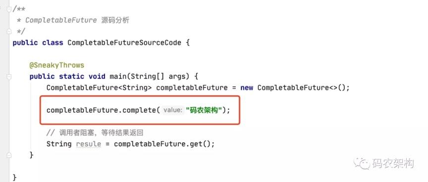 另外 1 个线程调用 complete 方法完成该 Future,则所有阻塞在 get() 方法的线程都将获得返回结果。