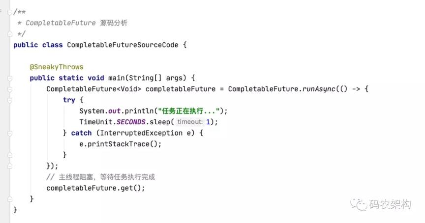 CompletableFuture.runAsync(…)传入的是一个 Runnable 接口, 在上面的代码中是使用了 Java 8 的 lambda 表达式的写法,和定义一个 Runnable 对象是等价的。