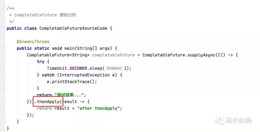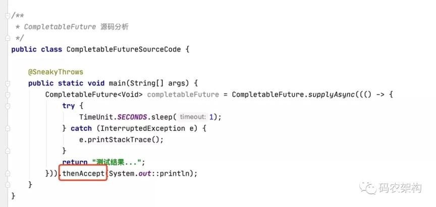 thenAccept 后面跟的是一个有参数、无返回值的方法,称为 Consumer,返回值也是 CompletableFuture;类型。顾名 思义,只进不出,所以称为 Consumer;前面的 Supplier,是无参数,有 返回值,只出不进,和 Consumer 刚好相反。