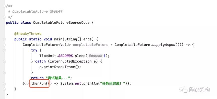 thenRun 后面跟的是一个无参数、无返回值的方法,即 Runnable,所以最终的返回值是 CompletableFuture;类 型。