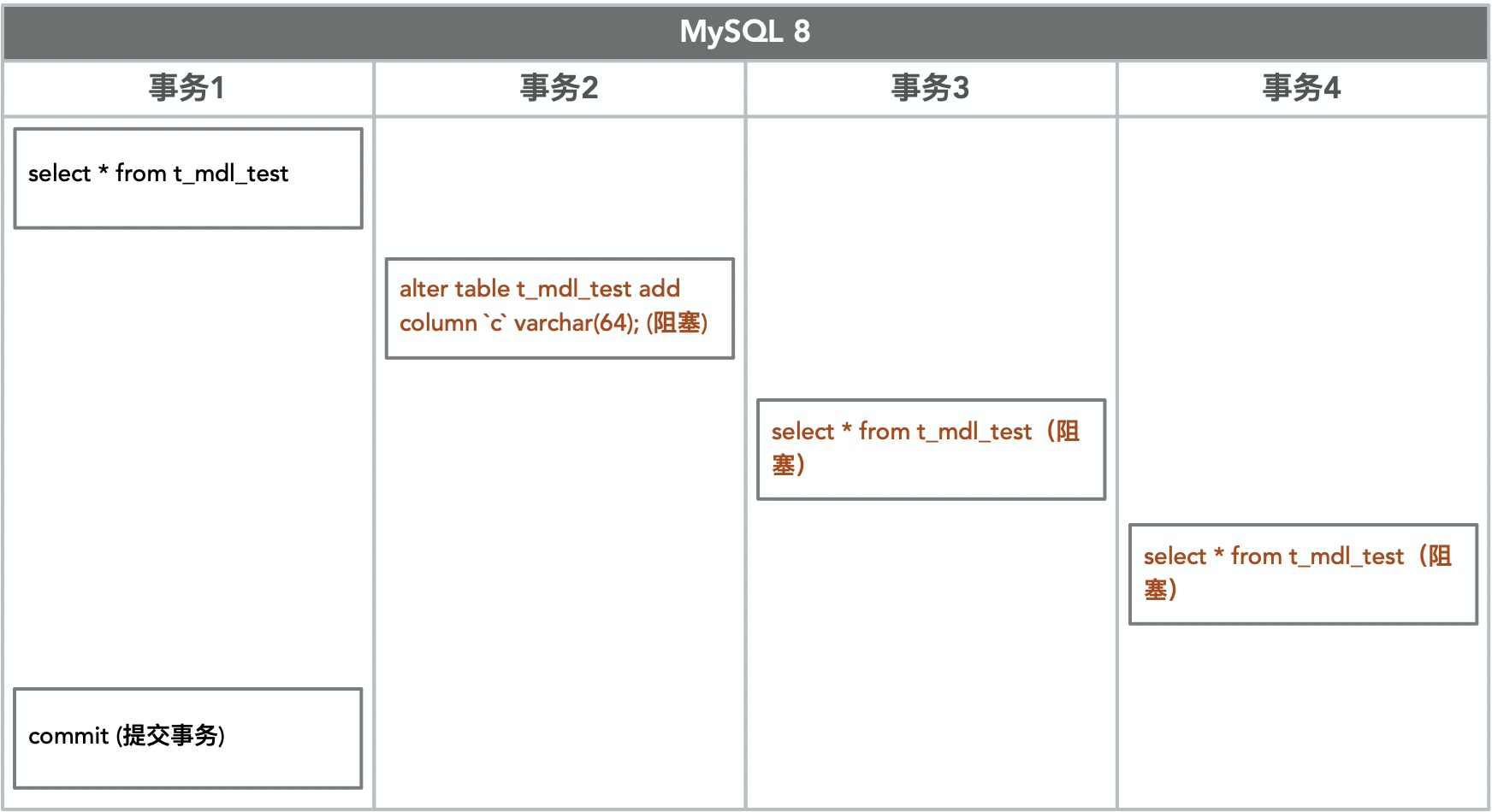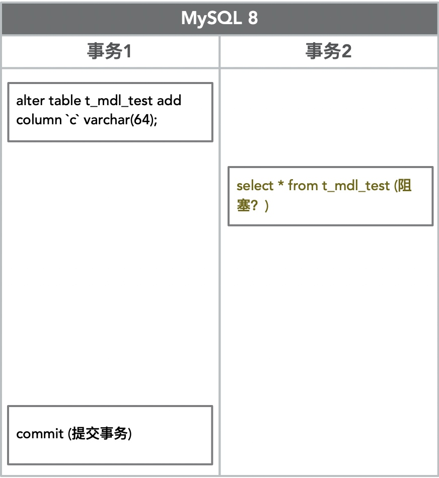 时刻1,事务1对表t_mdl_test进行查询,注意此时事务1并未提交,所以获取的MDL读锁也不会释放。时刻2另外一个线程想要添加字段c, 由于事务1正持着MDL读锁,所以事务2会陷入阻塞,等待事务1释放读锁后获取MDL写锁。