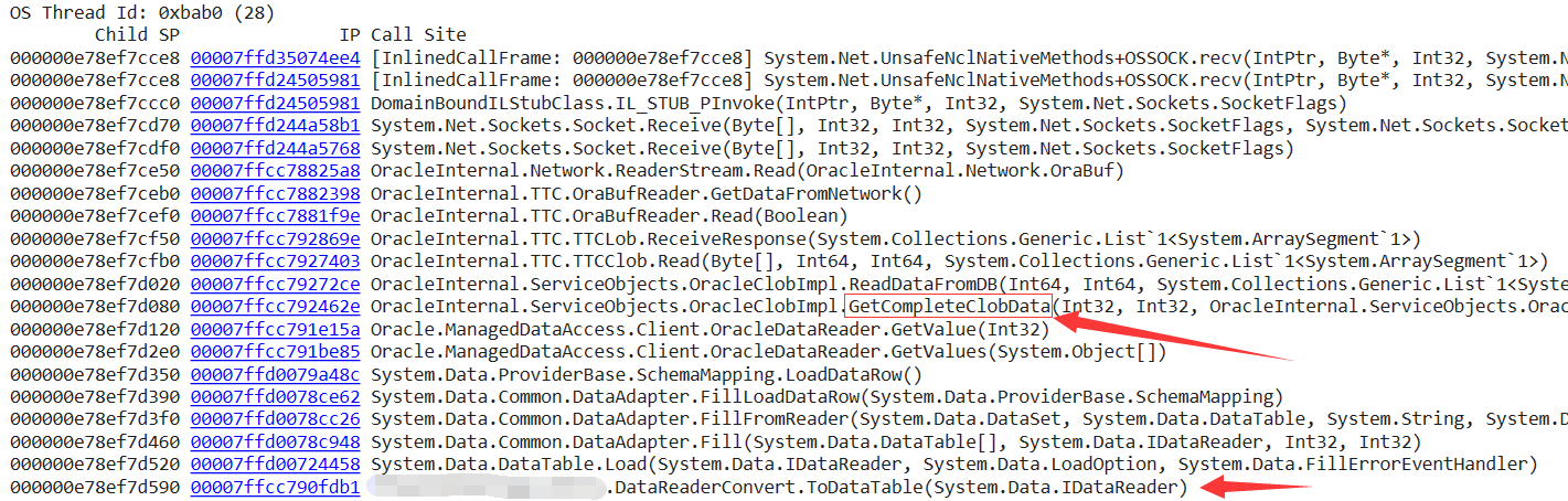 从线程栈上看,代码是通过 ToDataTable 方法将 IDataReader 转成 DataTable,在转换过程中读取了大字段,自然就有了 GetCompleteClobData,也就是说完美命中帖子所说,为了让结论更准确,我就去挖一下当前的 DataReader 已经读了多少行了?