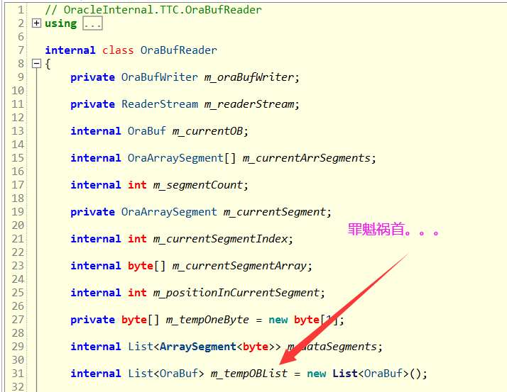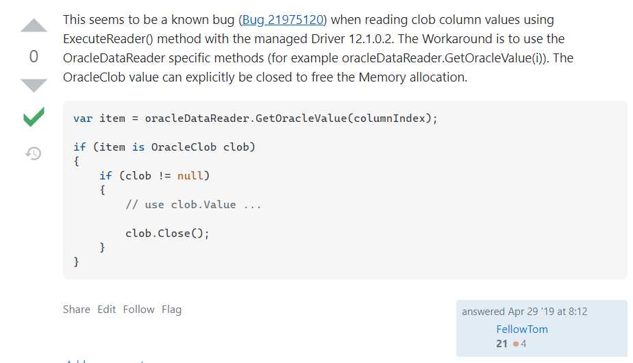 原来m_tempOBList是内存暴涨的罪魁祸首,这就很尴尬了,它为什么会暴涨? 为什么不释放? 由于我对 Oracle 也不熟悉,只能求助于神奇的 StackOverflow,我去,还真有天涯沦落人,Huge managed memory allocation when reading (iterating) data with DbDataReader